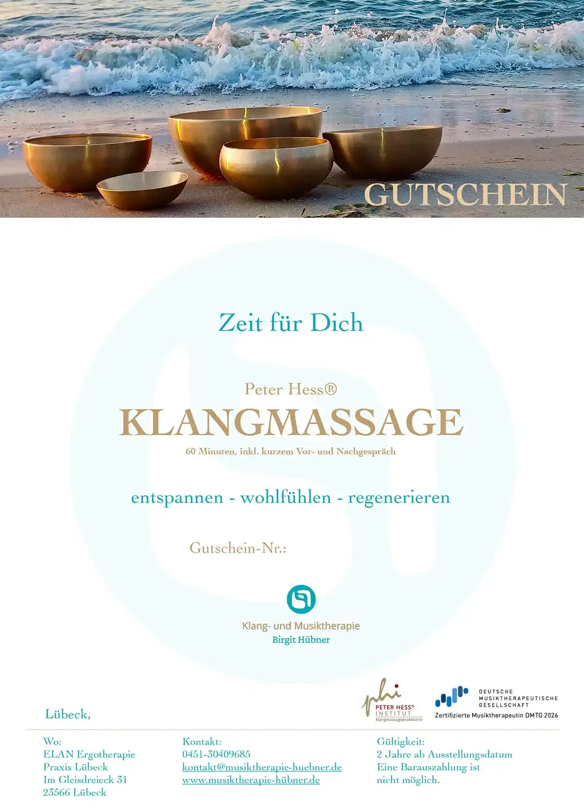 Die Peter Hess®-Klangmassage als ganzheitliche Entspannungsmethode spricht Körper, Geist und Seele an. Speziell entwickelte Therapieklangschalen werden gezielt auf -oder um- den bekleideten Körper positioniert und sanft angeklungen. Die zarten Klangschwingungen setzen sich im Körper fort und breiten sich nach und nach aus. Dies führt neben dem wohltuenden Klang zu einer tiefen Entspannung und hilft, körperliche Verspannungen und mentale Blockaden zu lösen. Der Geist kommt zur Ruhe und Gefühle von Geborgenheit, Sicherheit und Vertrauen werden geweckt.